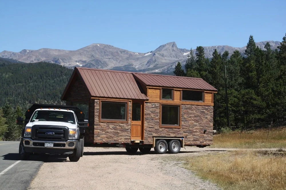 The Cozy Stone Tiny House displays its small size through both its warm atmosphere and stylish appearance and its distinctive personality. The Simblissity built tiny house located in Lyons Colorado functions as a 204 square foot mobile dwelling which combines traditional cottage design with contemporary architectural elements. The design uses Simblissity’s 24-foot Aspen model as its base but includes various enhancements which deliver exceptional value to customers-the lightweight stone exterior creates a classic European aesthetic which is both authentic and enduring.