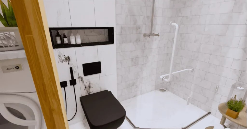 The bathroom also takes the same smart design route. The marriage of straight lines, storage efficiency, and premium materials proves that luxury is not necessarily tied to space. Everything you need is right there, without wasted space.