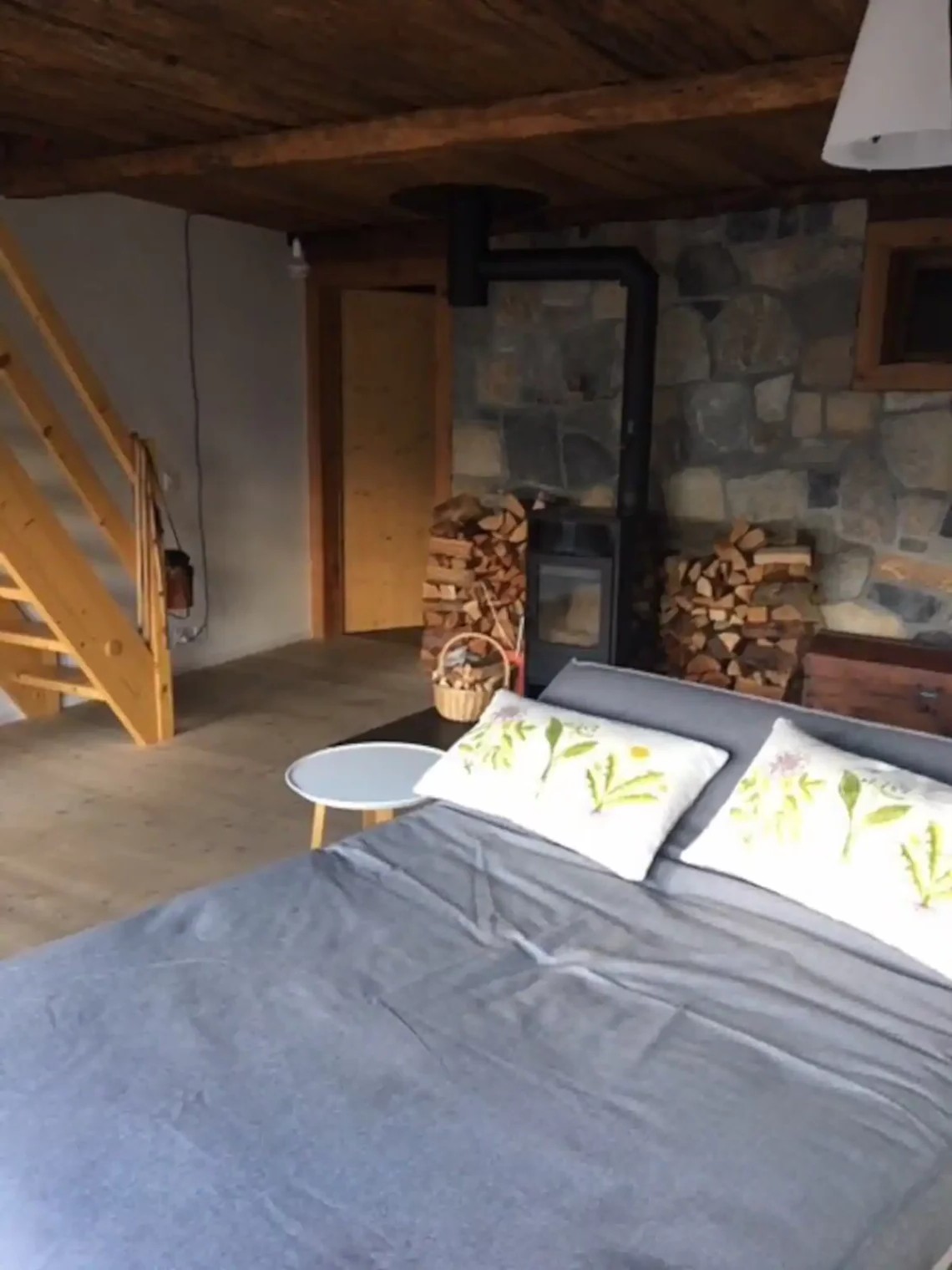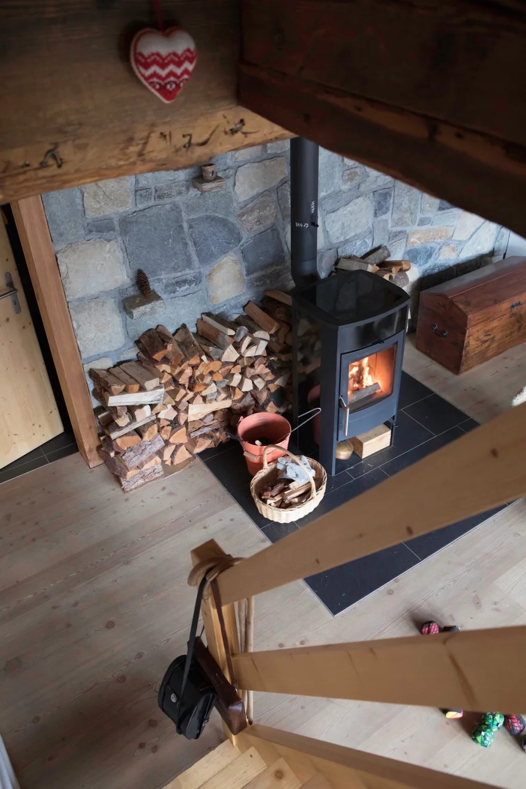 The living room centres around the wood-burning stove. The system provides heating for the room during cold mountain nights while creating a comfortable atmosphere. You can curl up on the comfortable sofa bed, sip a hot drink, and watch the mountains through the windows.