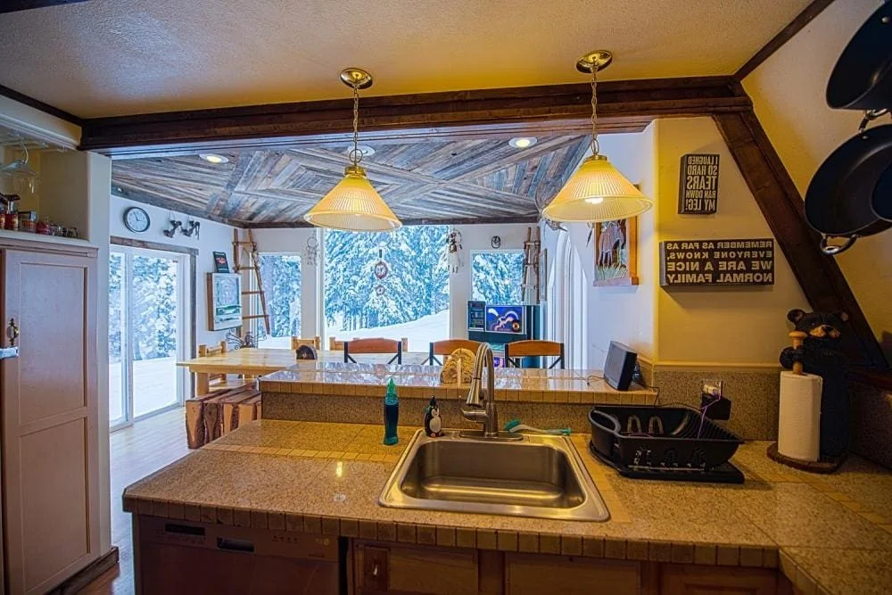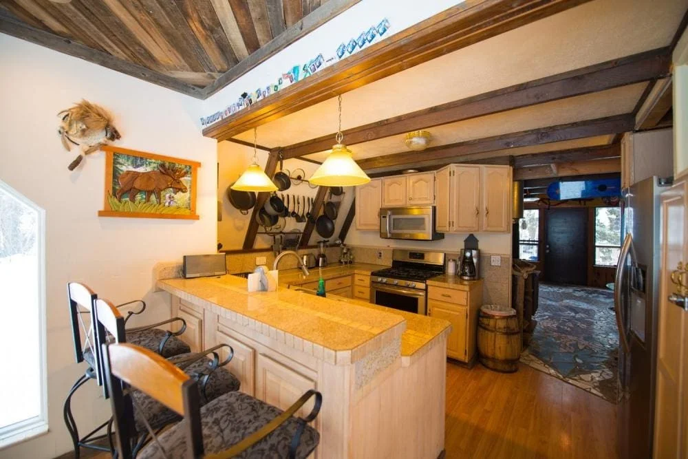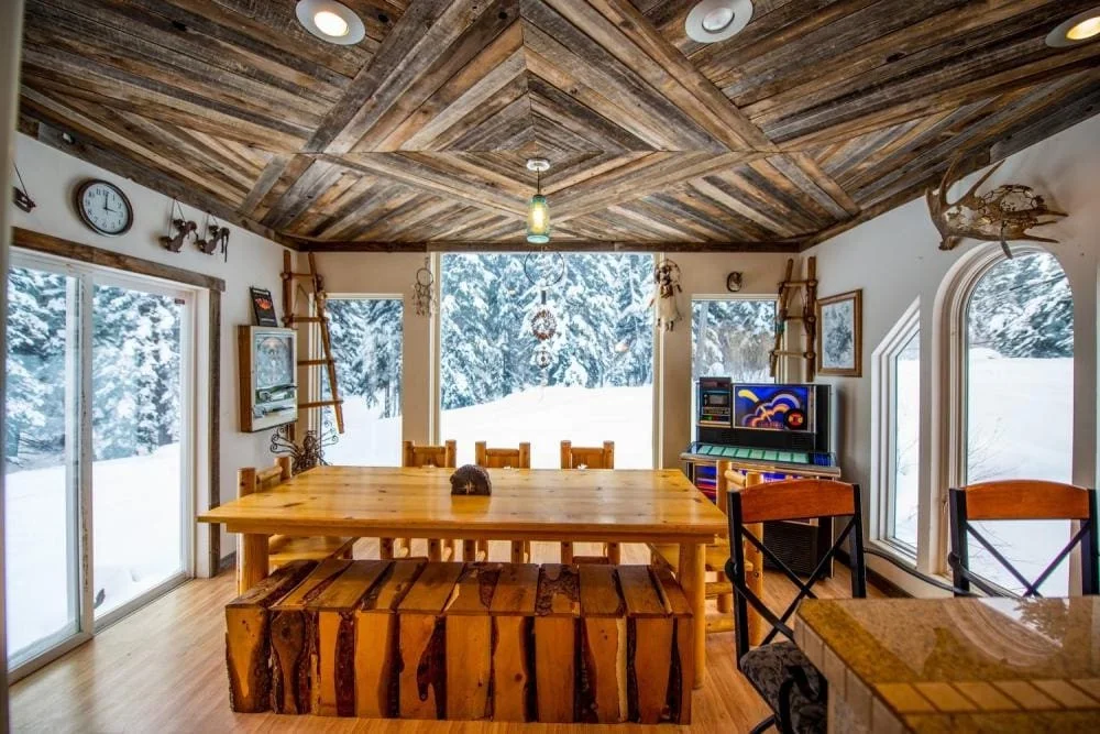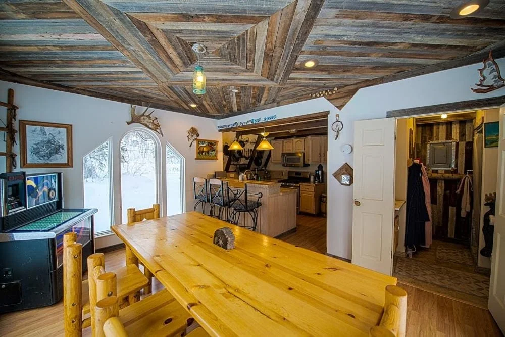 Inside, you’ll find flat-screen TVs, a fully equipped kitchen with stainless steel appliances, and a large log table that’s perfect for meals, games, or just hanging out. There’s even a vintage jukebox that adds a fun, nostalgic vibe to the space.