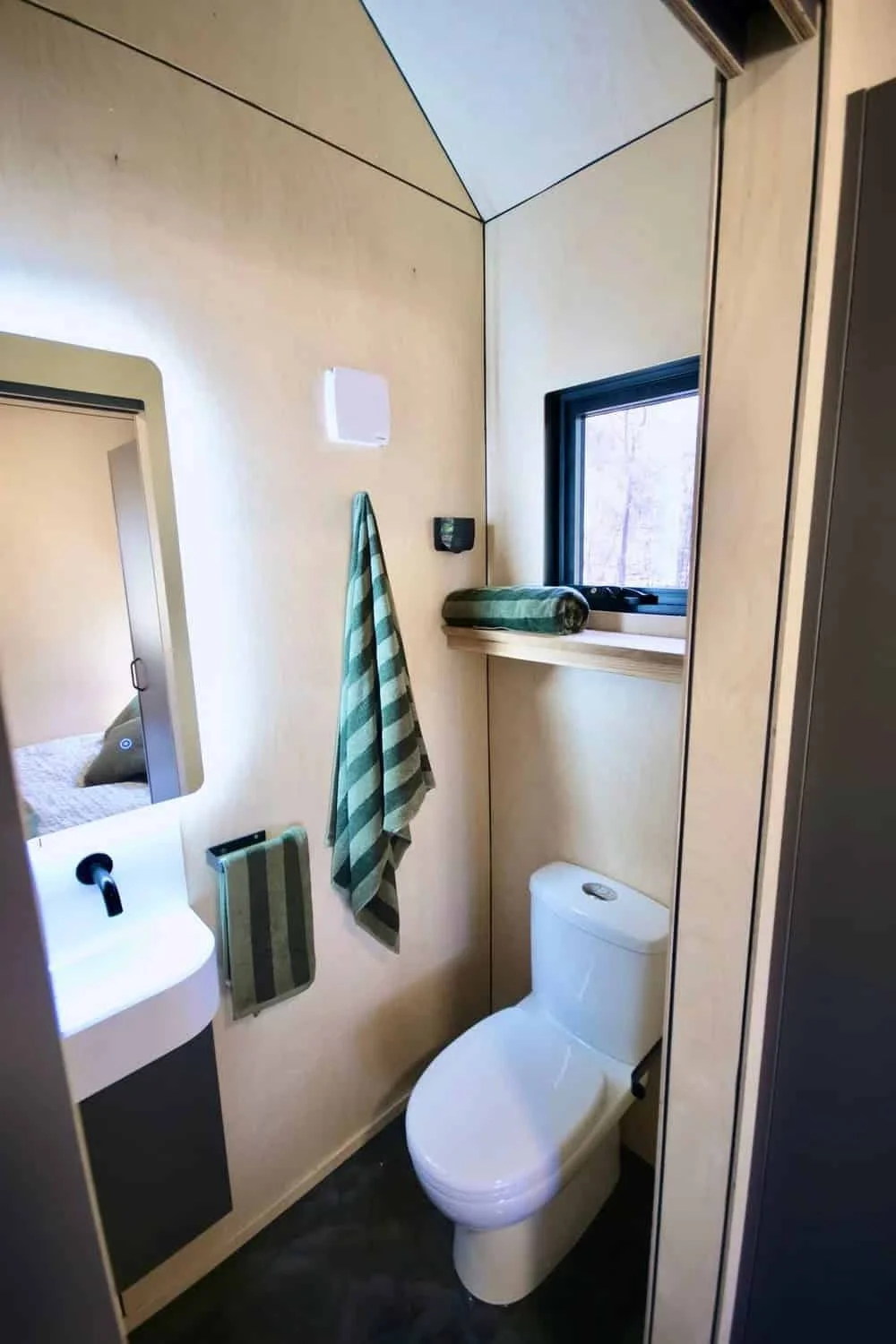 The bathroom may be compact, but it still includes everything you need for a comfortable stay. There’s a standard flush toilet, along with custom towel and toilet roll holders crafted by the Häuslein team.