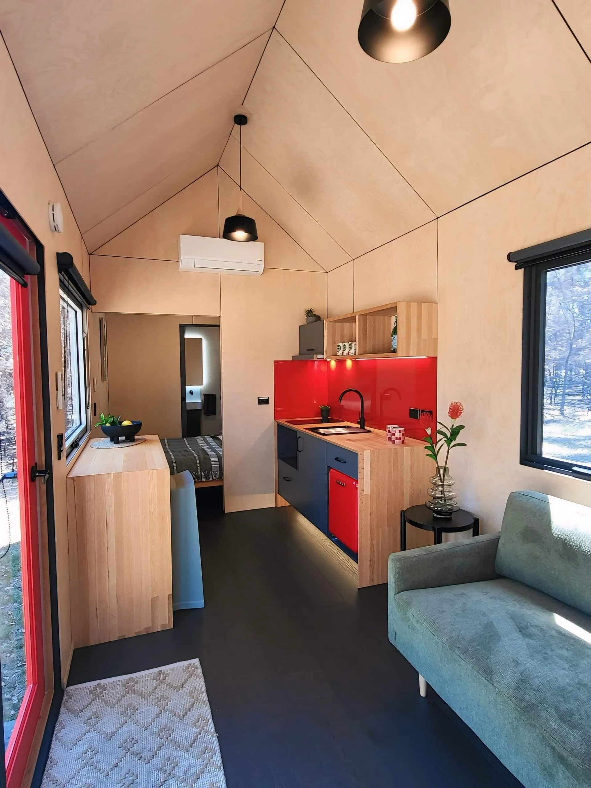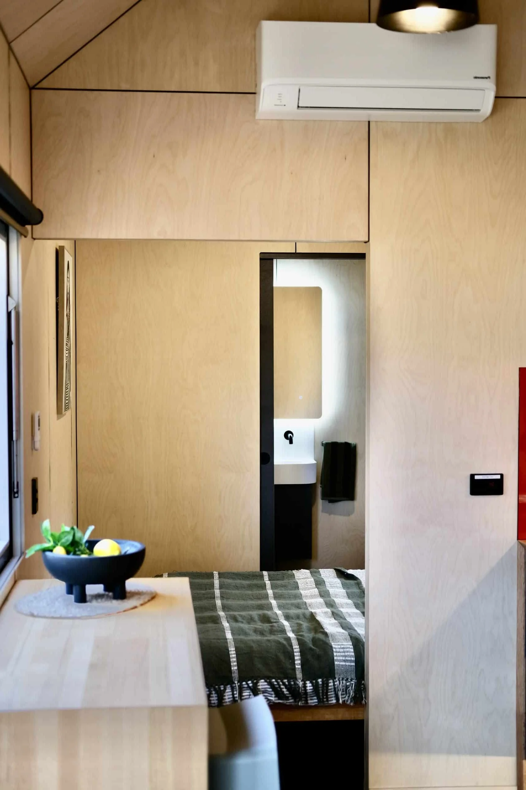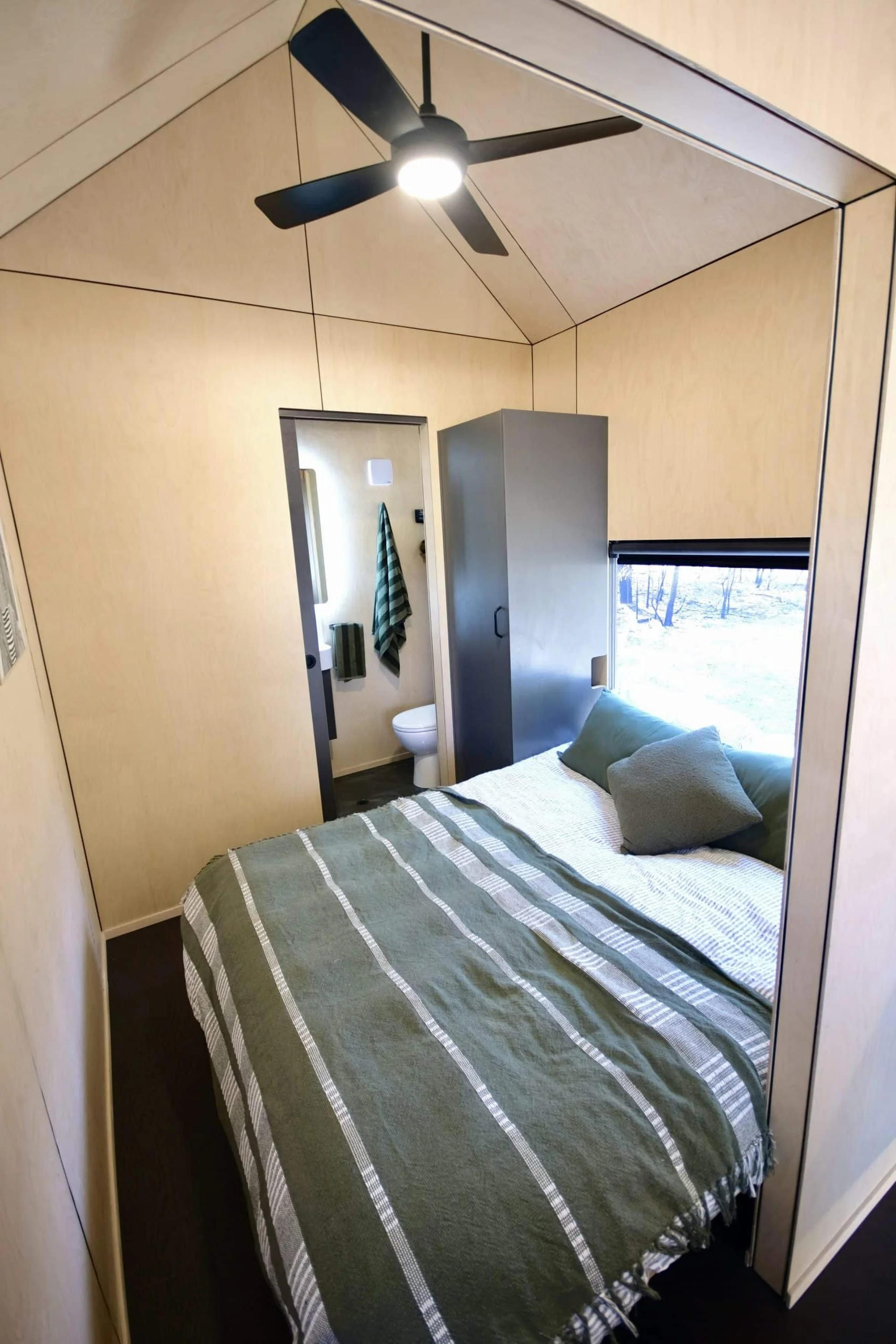 Unlike many tiny houses that rely on lofts, Eire includes a ground-floor bedroom. The room fits a queen-size mattress, which sits flush against the window to save space.