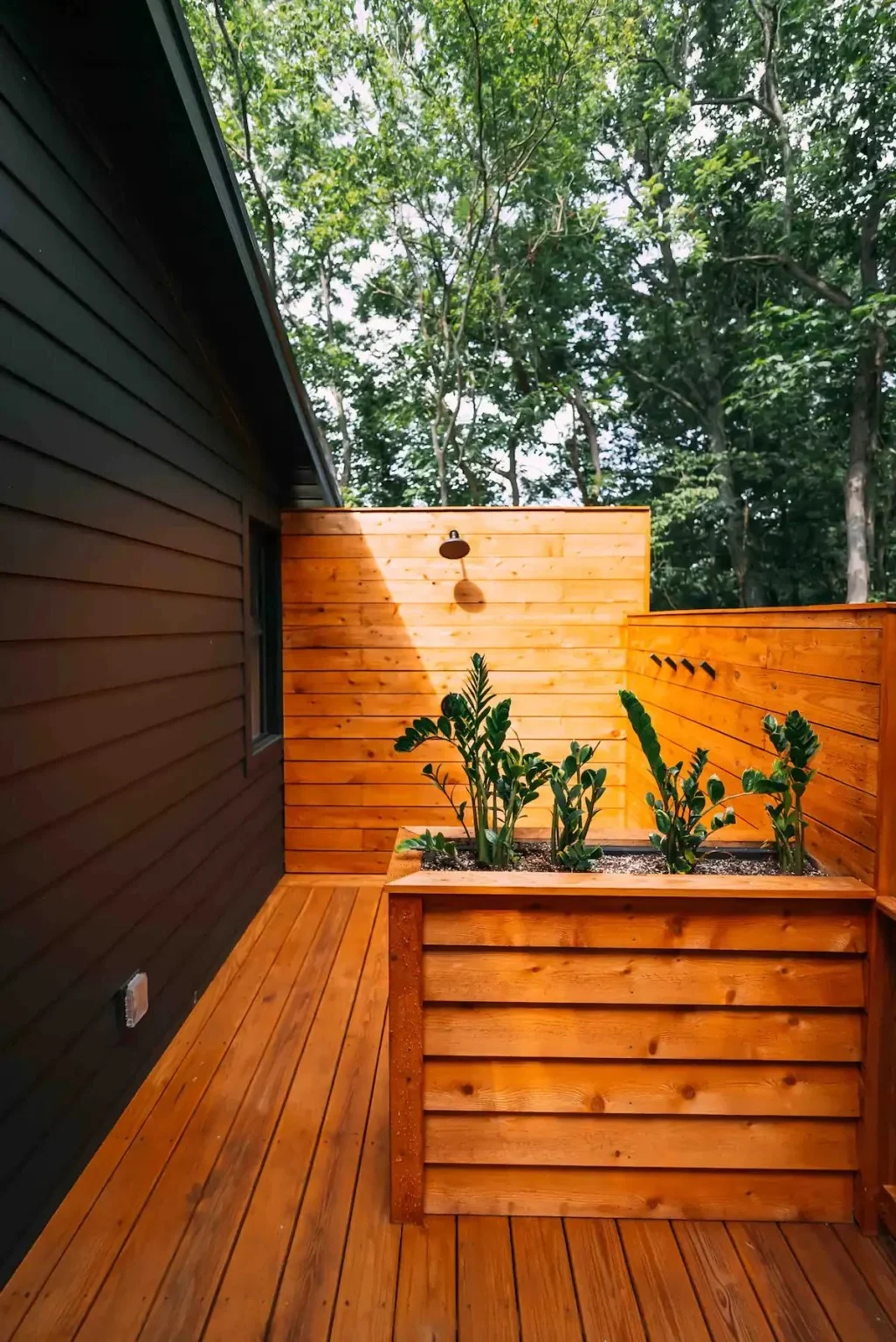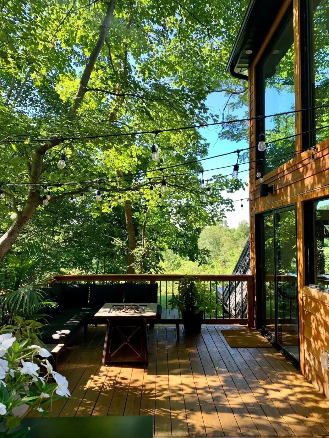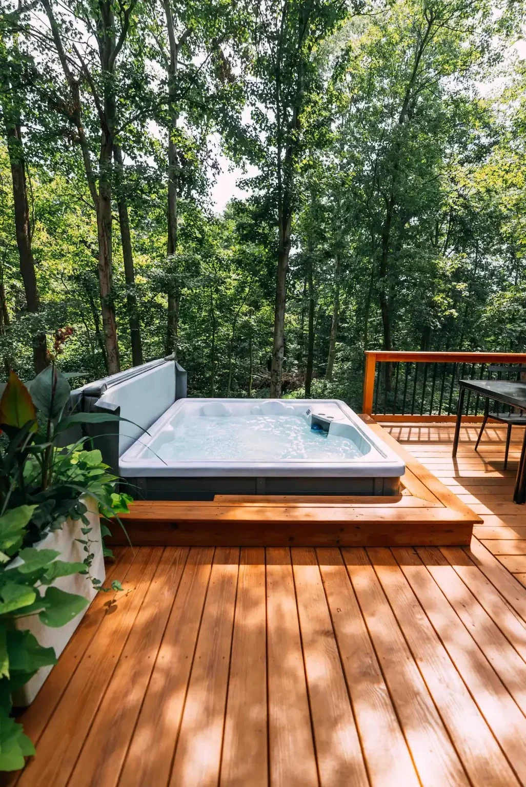 You might spend the afternoon in a hammock, listening to birds and feeling the breeze move through the trees. Or maybe you’ll settle into a chair on the private balcony with a good book. The main patio features a sunken spa, perfect for soaking under the stars. There’s even a cedar outdoor shower off the second-floor suite, which makes everyday routines feel like a spa moment in the forest.