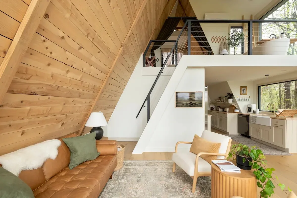 The Black Gables A-Frame functions as an uncommon accommodation because it offers visitors more than typical vacation rentals. The building contains authentic design work which artists freely shared with visitors to experience. The cabin interior shows the hosts’ dedication to natural elements which favour basic design and comfortable spaces.