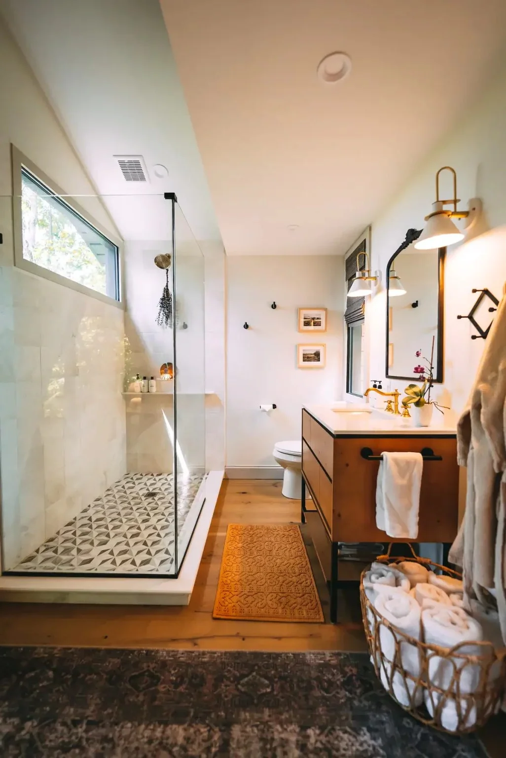 The real highlight is the soaking tub positioned with a view of the woods. It’s the perfect place to unwind at the end of the day. Draw a bath, watch the trees outside, and let the quiet do its thing. Velvet curtains add privacy, while the Italian-inspired tile shower with a glass surround completes the spa-like atmosphere.