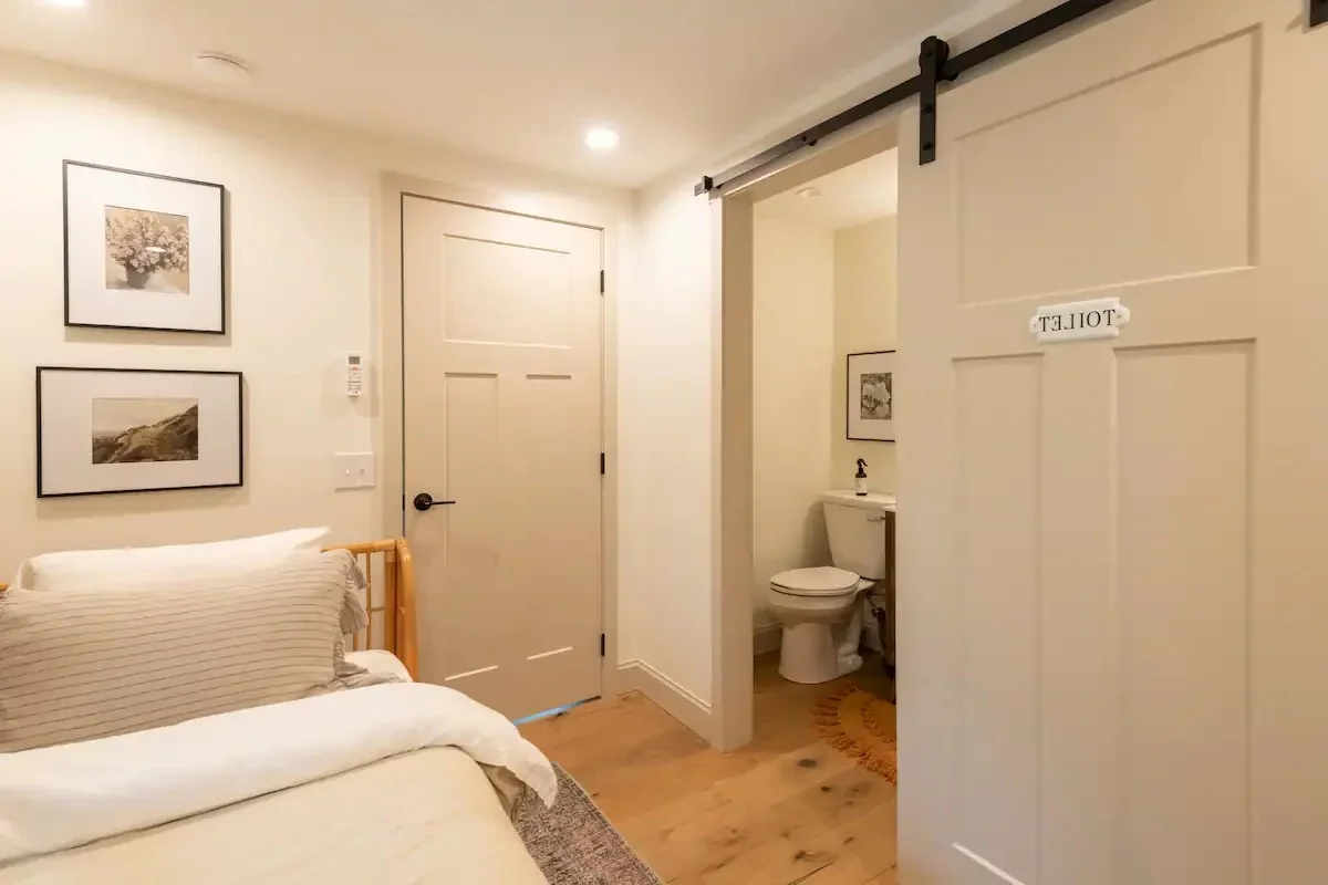 High-quality linens create a comfortable environment and the pellet stove together with the ductless heating and cooling system maintain ideal temperatures throughout all seasons. The total collection of items creates a space which appears to be maintained through care instead of being merely furnished with decorations.