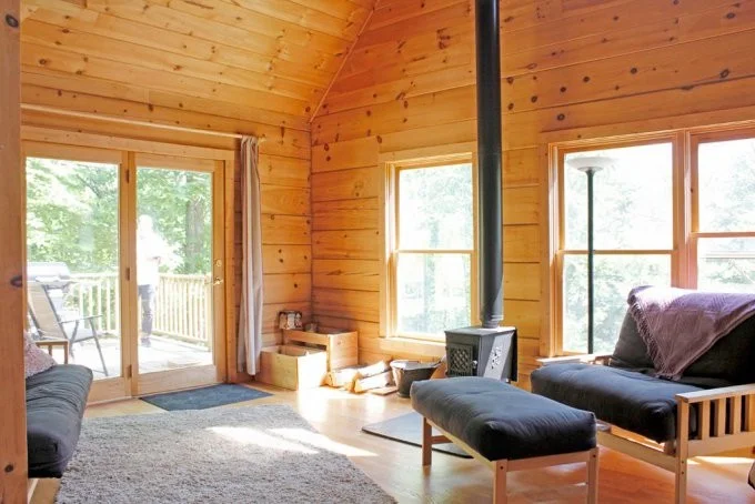 The log home maintains its bright and light interior despite its log construction. The cabin contains multiple large windows which bring in abundant natural light into the space. The daytime sunlight enters the rooms which causes the wood to shine and creates a joyful atmosphere throughout the entire room.