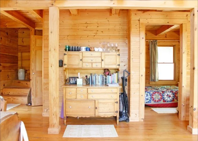 From the start, the home leans into classic log cabin charm. Natural wood is used throughout the interior, giving the space a rustic look that feels real and lived-in, not staged or overdone. You get that cozy cabin feeling the second you step inside.