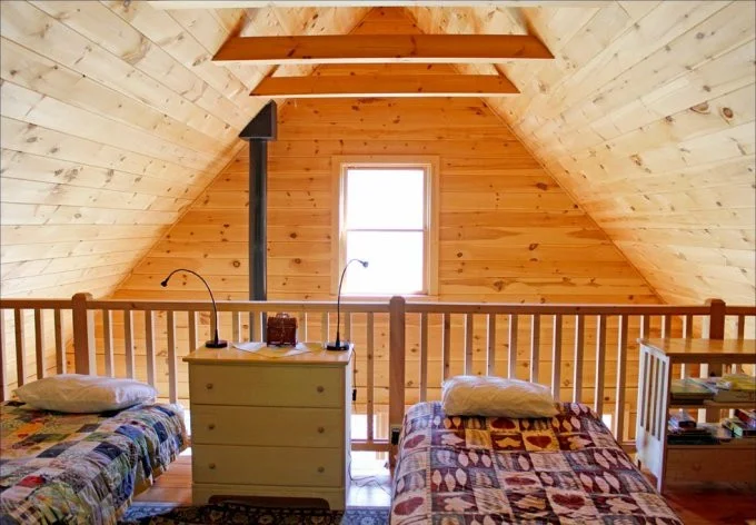 The space contains natural wood elements which create a warm atmosphere throughout. The walls display unfinished wooden material which reveals its natural grain and texture to establish a welcoming atmosphere in every room. The scent of fresh wood hangs in the air, adding to the whole cabin experience.
